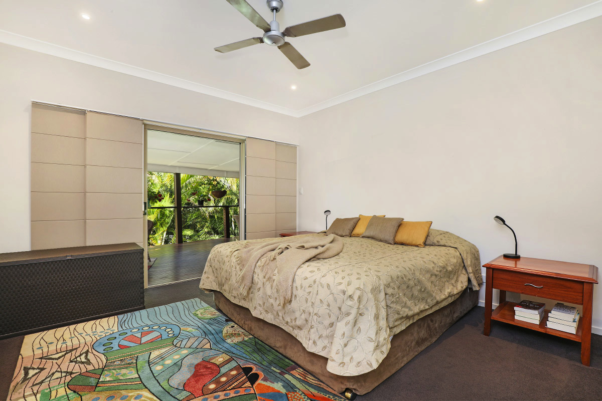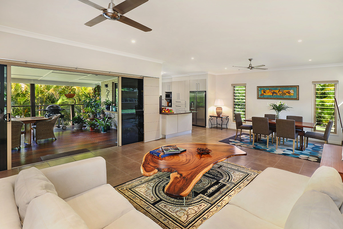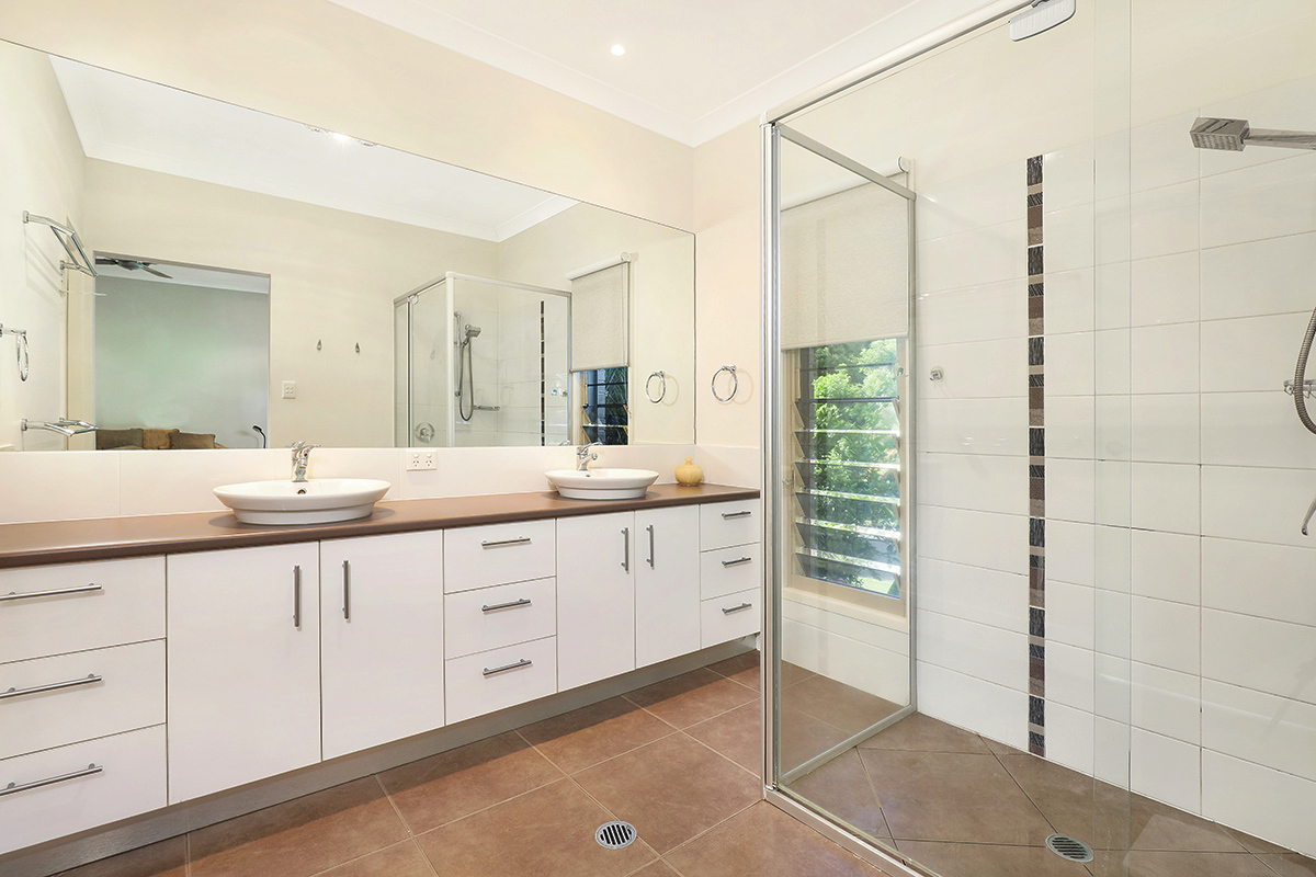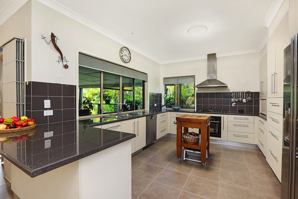 Enter through the grand pivot door on the main level to an office, master bedroom with generous sized walk-in wardrobe and ensuite with double vanities, air conditioning & ceiling fans, plus views to the lush green gardens.  Also on the main level is a large lounge and dining room including an oversized designer chef’s kitchen with quality appliance, plus a large 12m x 5m undercover entertainment veranda, also taking in the lush garden views.